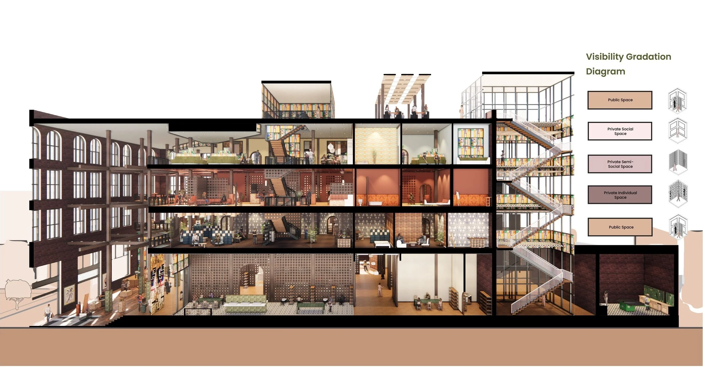 The driver for the design concept is to create a stimulating environment that is rooted in history and community in order to attract artists and visitors alike. This will be achieved through layering different levels of visibility through materiality throughout the space, representing the transition from guild separation to synergy. This will provide insight and allure to maker spaces and is essential for education and design-and-end-user connection. The design will embrace the ideals and nuances of crafters throughout the centuries, with unique furniture solutions, highly crafted interior-architectural elements, and rich materiality in the historic warehouse.