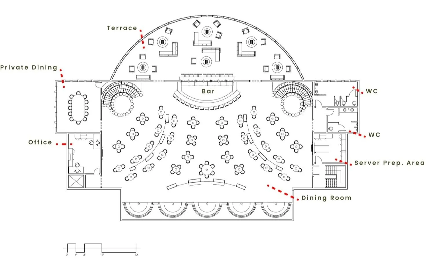 The Sunset Restaurant is located along the cliffs of the site’s peninsula . The Restaurant was oriented to take advantage of beautiful Bermudan sunsets, with completely unblocked ocean views. The restaurant provides three-meals a day to guests, as well as additional catering and room service functions. The first floor is comprised of a bar, lounge, billiards room, terrace, and kitchen, which is juxtaposed in color and materiality to the second floor which features an additional bar and terrace, as well as private dining and the main dining room.
