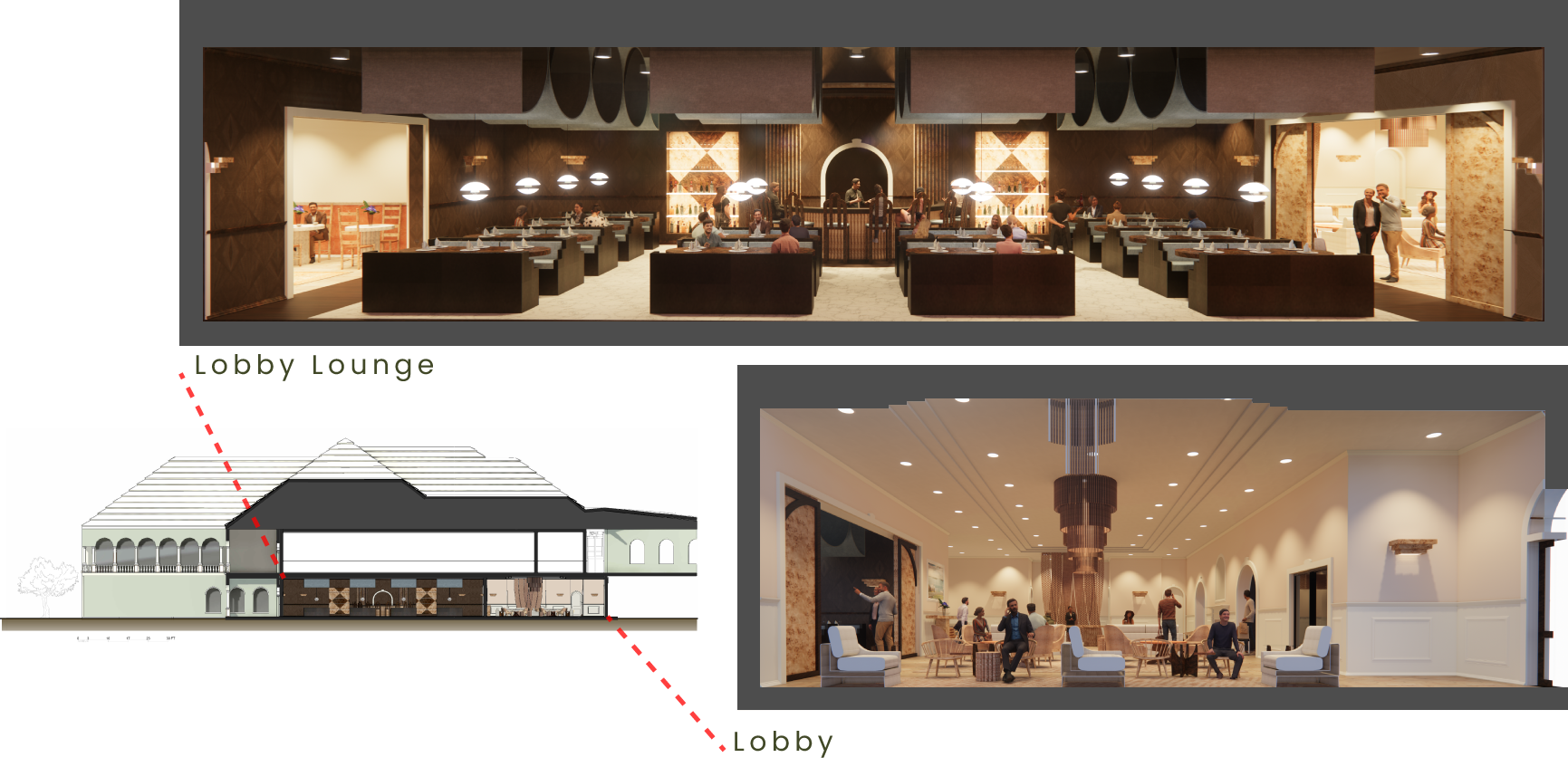 The Main House of the resort welcomes guests and is comprised of a Lobby, Lobby Lounge, and Lobby Bakery. The interior emphasis the juxtaposition between relaxed and formal, dark, and light, and Britain and the Caribbean.